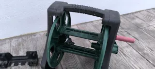 Enrollador de manguera de la marca Parkside, diseñado para organizar y almacenar tu manguera de jardín de forma eficiente. - Color negro y verde. - Incluye manivela para enrollar. - Soporte adicional para fijación.