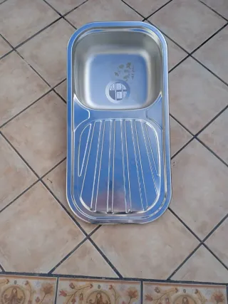 Fregadero de cocina de aluminio nuevo a estrenar, de un seno con escurridor. - Material: aliminio. - Diseño: Rectangular con esquinas redondeadas. - Acabado: Brillante.
