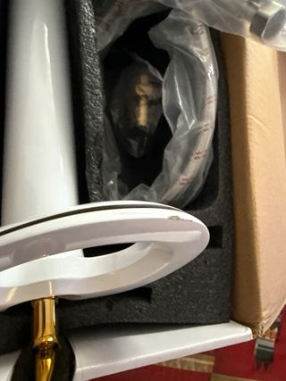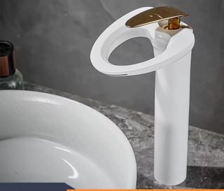 Elegante grifo para lavabo con un diseño moderno y distintivo. Combina acabados en blanco y dorado para un toque sofisticado. - Diseño curvo y estilizado. - Acabado mate en la base blanca. - Detalle metálico dorado en la palanca.