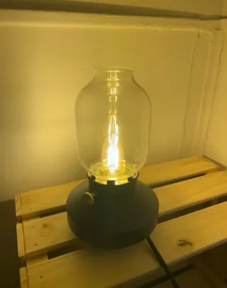 Lámpara de sobremesa Tärnaby de Ikea. Su diseño combina una base oscura con un cuerpo de cristal. Disponible dos unidades, negra y color crema. En Ikea nueva a 19,99€ unidad - Base de metal y plástico. - Cuerpo de cristal. - Bombilla de filamento visible.