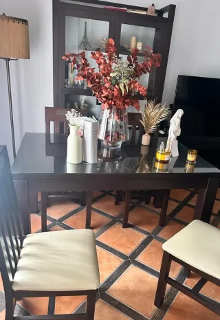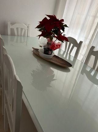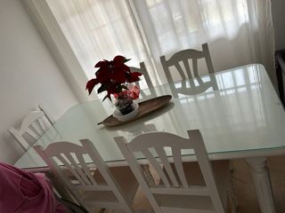 Conjunto de mesa de comedor con sillas de madera. - Mesa con superficie de cristal. - Sillas de madera y mesa pintadas en blanco. Le hace falta un repaso de pintura. Se incluye cristal y 6 sillas