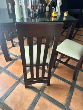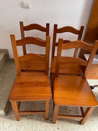 Se venden cuatro sillas de madera maciza con un acabado en tono marrón. Son ideales para cualquier comedor o espacio. - Fabricadas en madera maciza. - Diseño clásico y robusto. interedado recoger antes del dia 30 de Enero