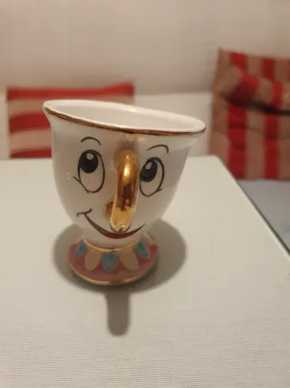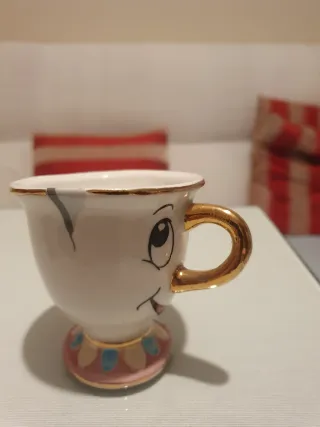 Adorable taza inspirada en el personaje Chip de La Bella y la Bestia. - Diseño clásico con cara sonriente. - Asa dorada. - Base decorada con detalles en rojo y azul.