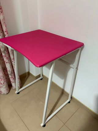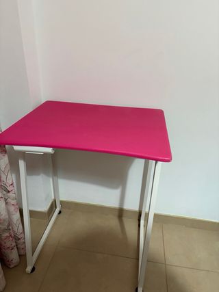 Práctico escritorio con un diseño moderno. Esta nuevo - Superficie de color rosa vibrante. - Estructura de metal blanco. - Tapizado sintético.