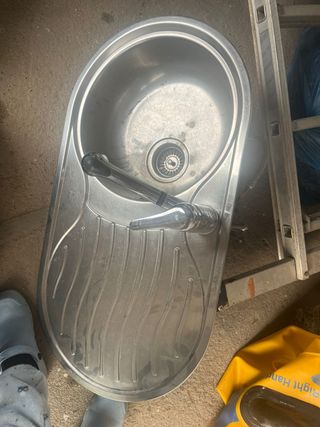 Fregadero de acero inoxidable con grifo incluido. Diseño ovalado con escurridor. - Material principal: metal. - Grifo con acabado cromado.