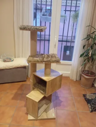 Fantástica casita para gatos con varios niveles y superficies para descansar y jugar. Ideal para que tu mascota disfrute. - Estructura de madera color roble con recubrimiento de tela de pelitos muy agradable al tacto. - Varias plataformas y cubiculos uno de ellos con agujero para entrar y salir. - Postes rascadores de sisal. - Estructura con un diseño muy bonito y moderno.