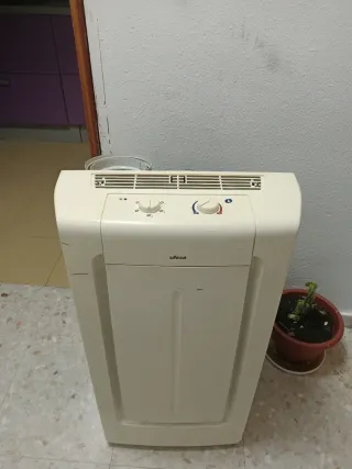 Aire acondicionado portátil de la marca Ufesa. Un aparato práctico para mantener la temperatura deseada. - Diseño moderno y compacto. - Panel de control intuitivo con dos diales. - Rejilla de ventilación superior.