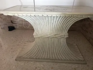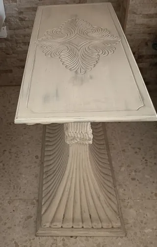 Elegante mesa con un diseño único y una base con detalles tallados. - Tapa de cristal. - Base de madera con acabado envejecido.