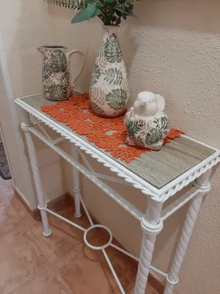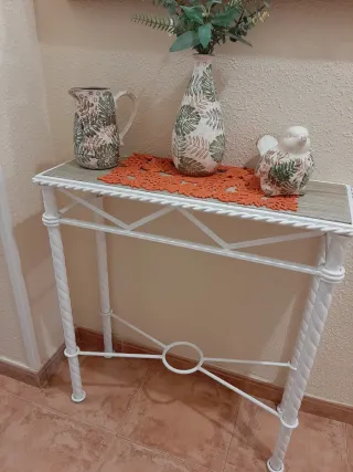 Mesita auxiliar de forja con sobre de madera. - Medidas: 72 cm de alto x 27 cm de ancho. - Diseño elegante con detalles en espiral.