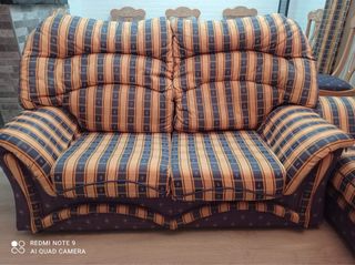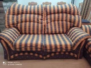 Cómodo sofá de dos plazas con un diseño de rayas verticales en tonos naranja y azul. Su tapicería de tela le da un toque acogedor. - Diseño de rayas verticales. - Tapicería de tela.