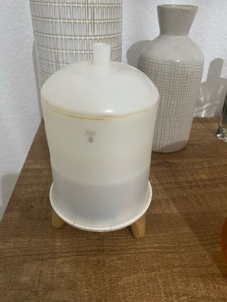 Elegante difusor de aromas de la marca Esteban con un diseño retro y un acabado en cristal rosa. - Cuerpo de cristal acanalado. - Base con patas de madera. - Detalle de la marca 'ESTEBAN' en la base -funcion intermitente -valorado en 80€