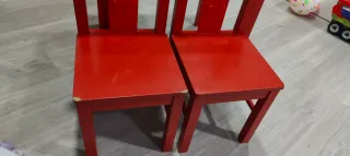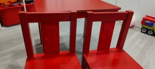 Conjunto de mesa y dos sillas infantiles de color rojo, perfectas para juegos y actividades. - Diseño robusto y seguro. - Sillas con respaldo decorado con figuras. - Ideal para habitaciones infantiles o zonas de juego.