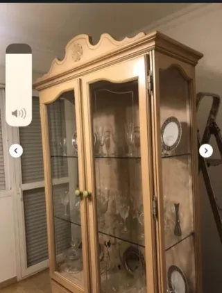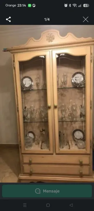 Elegante mueble de salón con puertas de cristal y detalles verdes. - Estructura principal de madera. - Puertas de cristal para exhibir tus objetos. - Acabado en color verde. en perfecto estado, de madera provenzal, como nuevo, Precio negociable