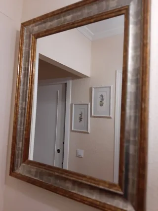 Elegante espejo con un marco de madera que combina tonos dorados y plateados, aportando un toque de distinción a cualquier espacio. - Marco con diseño bicolor. - Acabado que combina oro y plata.