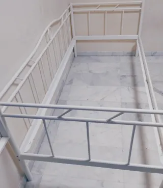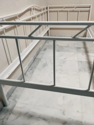 Estructura de diván en forja de color blanco. Un diseño clásico y elegante para cualquier habitación. - Fabricado en metal resistente. - Diseño de cabecero y piecero con barrotes. Medidas 200 cm de largo, 90 cm de ancho. Medida exterior 204 cm de largo y 94 cm de ancho. Altura desde el suelo 74 cm. Altura desde el suelo al larguero de abajo 27 cm. Regalo el somier de láminas, al quitarlo he roto una de ellas, pero puede usarse sin problema ninguno. NO HAGO ENVÍOS.