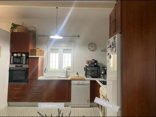 Conjunto de muebles de cocina en tonos madera y blanco. - Muebles de madera. - Detalles en metal.