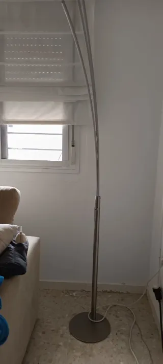 Elegante lámpara de pie con un diseño curvo y moderno. Perfecta para iluminar cualquier rincón de tu hogar. - Acabado en metal plateado. - Base redonda y estable. - Altura ajustable. - Regulación de intensidad