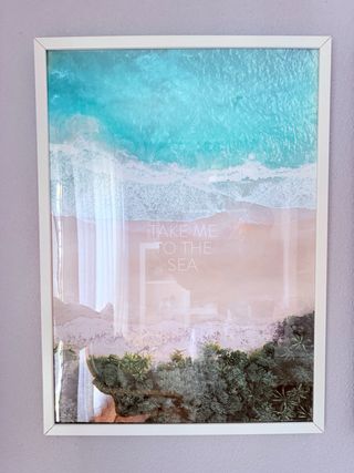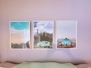 Conjunto de tres láminas / lienzos decorativas para dar un toque especial a tu hogar. Incluyen paisajes de playa, montaña y ciudad. - Lámina con paisaje de playa y mar. - Lámina con paisaje de montaña y furgoneta. - Lámina con paisaje urbano y cúpula. Material de muy buena calidad, tela impermeable. Incluye marco cuadro modelo Fiskbo de Ikea. Tamaño 50 x 70 cm. Venta por cambio de decoración. Precio del conjunto.
