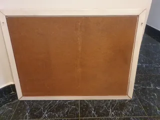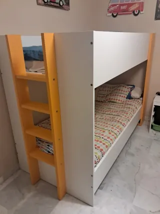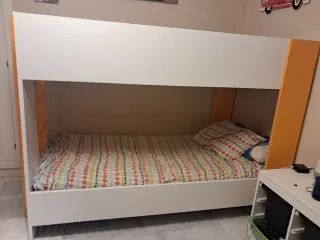Madera de la que desconozco si es aglomerada, color blanco y naranja. Buen estado. Se recoge en Benacazón. Regalo el somier y un colchón. Se ve en Benacazón y se entrega desmontada, aunque para desmontar hay que pagar una pequeña reserva para evitar que tras el desmontaje se echen para atrás. La medida es la normal de 90 por 190.