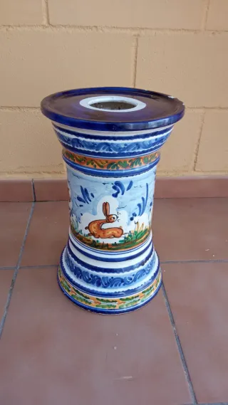 Base de cerámica decorada con un diseño de conejo y motivos florales. Ideal para colocar macetas. Con algún pequeño desperfecto - Diseño pintado a mano. - Tonos azules y multicolor. - Material de cerámica resistente.