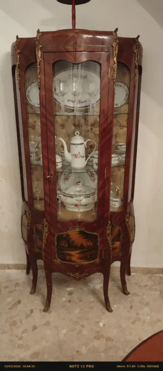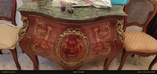 Elegante mueble antiguo con un diseño detallado y acabados de calidad. Pieza es una vitrina francesa antigua del siglo XIX, probablemente de estilo Luis XV o Luis XVI, caracterizada por su estructura de madera con marquetería y aplicaciones de bronce dorado.Una cómoda de estilo Luis XV con encimera de mármol verde y ornamentación de bronces dorados.Un secreter o escritorio de estilo clásico, probablemente de la época Biedermeier o Louis Philippe. Este mueble es un sofá de estilo isabelino o Luis XV con respaldo tapizado en capitoné y estructura de madera tallada. Estilo: Luis XV, caracterizado por líneas curvas, elegancia y detalle