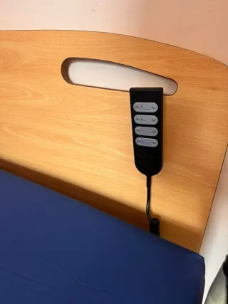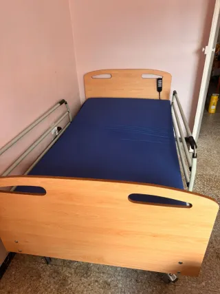 Cama geriátrica con carro elevador, ideal para cuidados en el hogar. - Medidas de 105x190 cm. - Estructura de madera en cabecero y piecero. - Laterales de metal. - Colchón azul. -Incluye colchón antiescaras