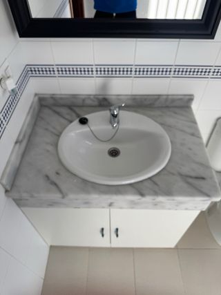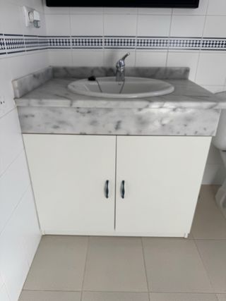 Mueble de lavabo con una elegante encimera de mármol. - Diseño moderno y funcional. - Acabado en blanco con detalles en mármol gris y blanco. - Se vende por reforma, aporto medidas: Ancho x alto x profundidad 87,5 x 68 x 57,5 cm (mueble) 90 x 16 x 60 cm (encimera) Se incluye seno de la marca roca y grifo.
