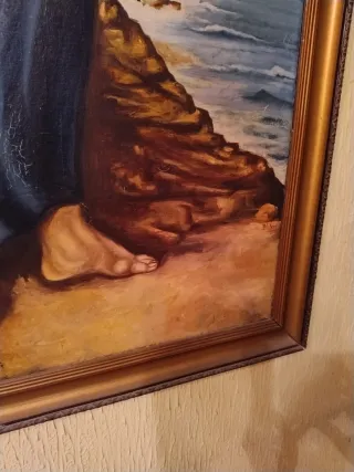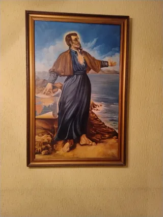 Pintura religiosa de San Francisco Javier, representando una escena marítima. - Marco dorado. - Representación detallada del santo con un mapa. Mide 128 x 85 cm