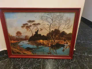 Precioso cuadro pintado a mano que representa un paisaje. - Marco de madera. - Escena de caza en un estanque.