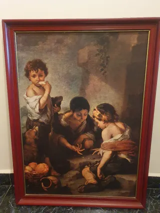 Precioso cuadro decorativo con una escena de niños jugando. Ideal para añadir un toque artístico a cualquier estancia. - Representación de niños en un entorno rústico. - Marco de madera integrado.