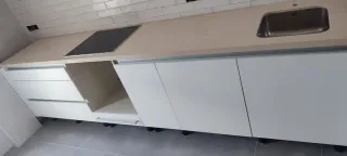 Conjunto de muebles de cocina en tonos beige y blancos. - Diseño moderno y funcional. - Combinación de materiales de calidad.