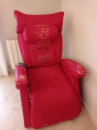 Sillón reclinable con funciones de masaje, vibración y calefacción. 1° foto como era en principio, 2° foto, estado actual, tapicería gastada por uso. - 3 funciones de masajes que funcionan perfectamente, a la vez que vibra hasta zona de piernas y brazos. - Mando a distancia incluido. - Cojín reposacabezas. - Tapicería de polipiel. Puede probarse antes de comprar para comprobar funcionamiento de las opciones de masaje. No sé envía, solo para recoger aquí.
