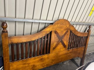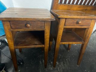 Conjunto de dos mesitas de noche y un cabecero a juego, fabricados en madera. - Diseño clásico y elegante. - Cada mesita cuenta con un cajón y un estante inferior. - El cabecero es de estilo rústico con listones verticales.