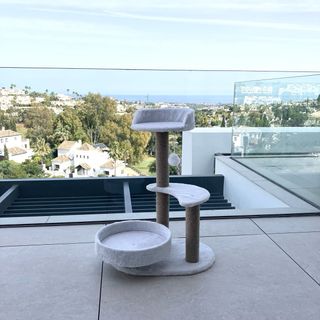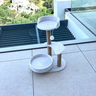 Rascador para gatos de varios niveles, ideal para que tu mascota juegue y descanse. - Plataformas acolchadas para mayor comodidad. - Poste forrado para afilar las uñas. - Diseño moderno y elegante.