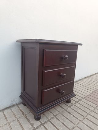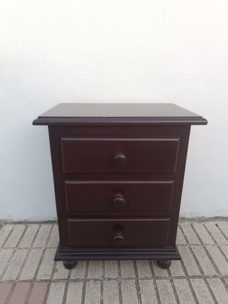 Habitación de Madera Maciza de Pino en buen estado compuesta por: - 2 Somieres de 90x190 de lamas reforzadas. - 1 Mesita de noche de 3 cajones de 41x60x32. - 1 Escritorio con cajonera de 4 cajones y cristal sobre la base de 105x75x55. - 2 Cabeceros y 2 Pies para camas de 90. - Diseño clásico y elegante. - Acabado en color wengue. - Tiradores redondos.