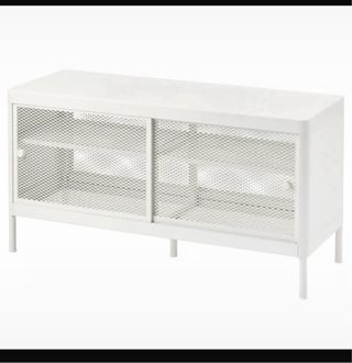Mueble de salón o recibidor de diseño moderno. - Puertas correderas de metal. - Acabado en color blanco. - Muy bueno para zapatos - Con dos baldas interiores
