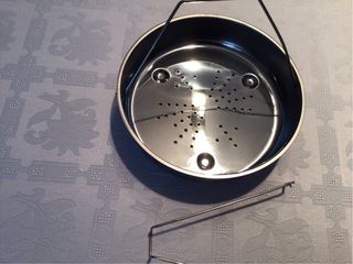 Cestillo de acero inoxidable para cocer al vapor. - Material: Acero inoxidable. - Diseño con perforaciones para el vapor. - Asa para facilitar su manejo.