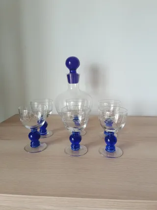 Elegante juego de seis copas de cristal con un diseño grabado y base de color azul. - Incluye una botella a juego con tapón azul. - Base de las copas con diseño de bolitas azules. - Detalles grabados en el cristal de las copas y la botella.