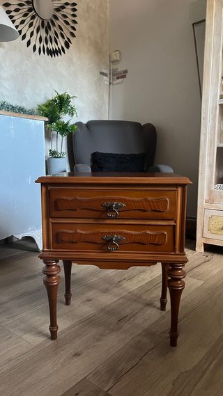 Mesilla de noche clásica de madera. - Dos cajones con tiradores ornamentados. - Patas torneadas de estilo tradicional. - Diseño elegante y funcional.