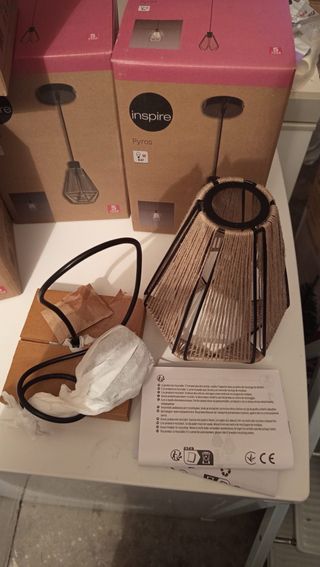 juego de 4 lamparas, se pueden vender por separado las que se necesiten Lámpara colgante Inspire Pyros, ideal para dar un toque cálido a tu hogar. Su diseño combina materiales y colores que aportan estilo. - Estructura metálica negra. - Pantalla de yute. - Casquillo E27.