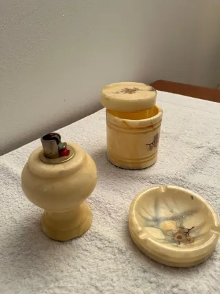 Conjunto de accesorios para fumadores con un diseño único. - Encendedor con base de marmol - Cenicero con detalles florales. - Portavasos o recipiente cilíndrico.