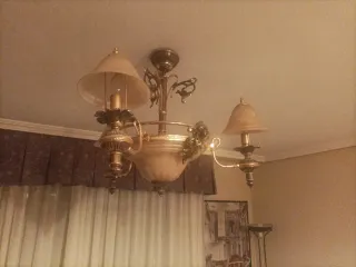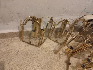 Conjunto de lámparas de diseño clásico: 9 apliques de pared, 2 lamparas de techo normales y 1 más grande, perfectas para iluminar tanto paredes como techos. Su acabado metálico dorado aporta un toque de elegancia. 12 en total, estaban puestas en un portal. - Estructura principal de metal. - Detalles en cristal transparente. 70€ todas las lámparas.