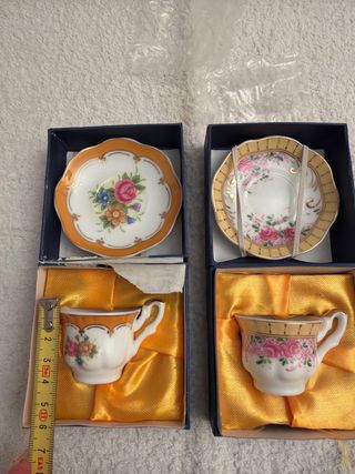 Conjunto de dos mini tazas de té con sus platillos. - Diseño floral. - Borde decorativo.