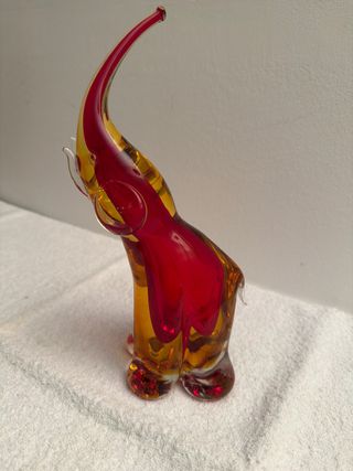 Figura decorativa de elefante con un diseño artístico. - Elaborado en cristal soplado. - Combinación de colores dorado y rojo vibrante. - Estilo Murano. - Trompa levantada y detalles fluidos.