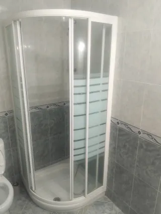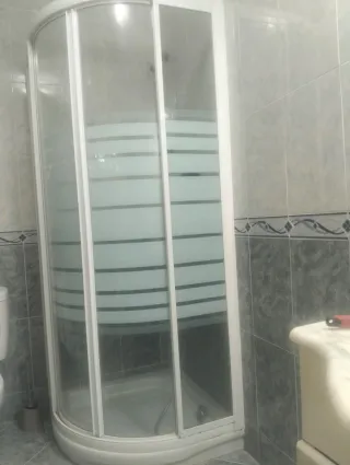 Mampara circular para ducha, con un diseño moderno y elegante. 80x80 Habría que cambiar los rodillos - Perfiles en color blanco. - Paneles de cristal y plástico. - Forma curva para adaptarse a platos de ducha semicirculares.