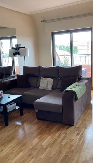 Vendo sofá modular de 3 plazas con chaise longue. Tapizado en color marrón, incluye dos cojines a juego y cuenta con un práctico baúl con gran capacidad de almacenaje. Es un sofá muy cómodo y mullido. Tal y como se aprecia en las fotos, presenta algunos detalles de uso: un brazo ligeramente hundido, un parche cosido en la parte inferior y un pequeño desperfecto en el asiento. Aun así, es un sofá moderno, funcional y muy versátil. Se vende por mudanza, ya que en el nuevo piso ya disponemos de sofá. Se puede venir a recoger.
