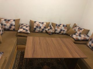 Conjunto de salón con sofá marroqui y cojines decorativos y mesa Medidas: 1’80cm 2’30cm 1’96cm - Tapicería en tono marrón. - Cojines con estampado geométrico hexagonal en tonos tierra, negro y blanco. - Diseño moderno y confortable.