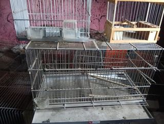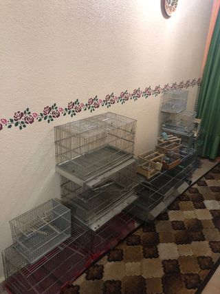 Conjunto de jaulas para pájaros de diferentes tamaños. - Jaulas metálicas plateadas. - Algunas jaulas incluyen bandejas rojas. - Varias jaulas apilables. Diferentes precios todo al privado
