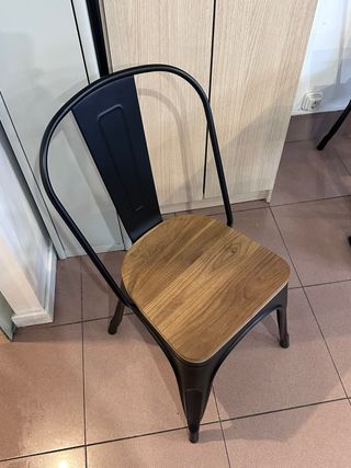 Silla de diseño industrial con asiento de madera y estructura metálica. - Asiento con acabado en madera. - Patas y respaldo de metal negro.