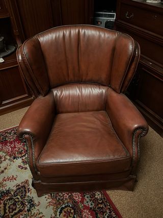 Elegante pareja de sillones de cuero en tono marrón. Añaden un toque clásico a cualquier espacio. - Tapicería de cuero de alta calidad. - Diseño tradicional con detalles de tachuelas. - Asientos cómodos y respaldo envolvente.